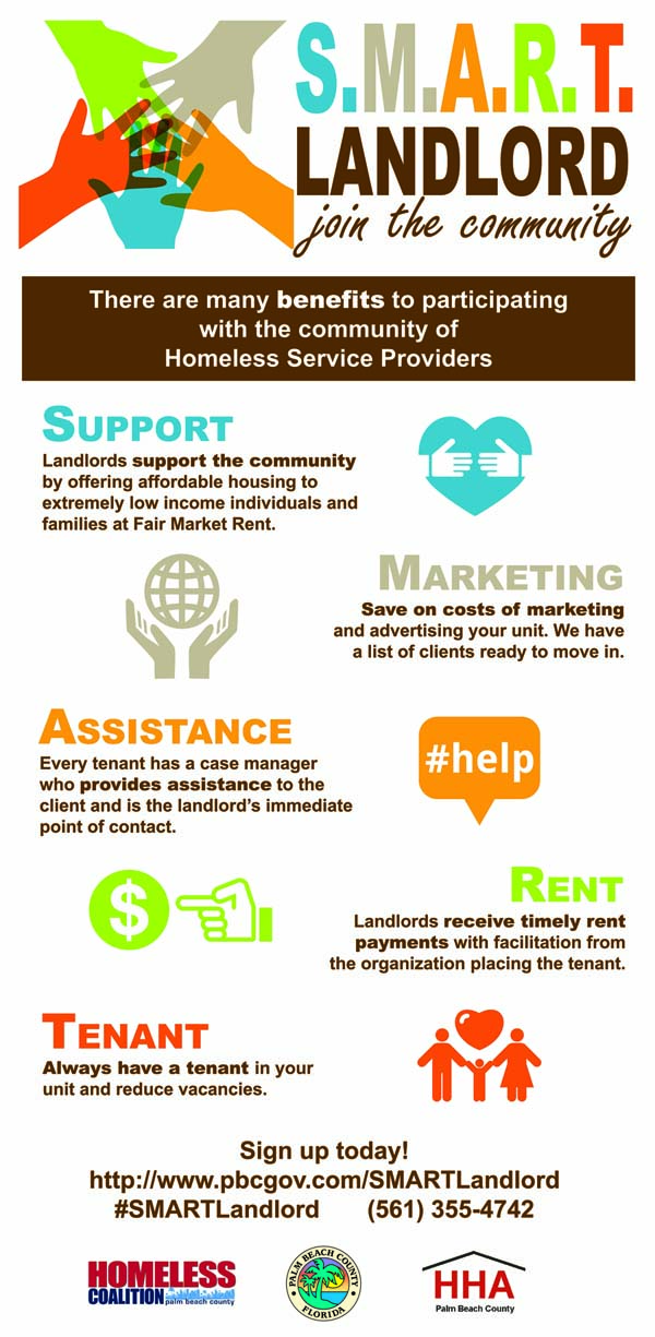 The campaign is a shared effort by homeless services providers in Palm Beach County to bring new landlords on board to make affordable units available to individuals and families. Our ultimate goal is to end homelessness and we know that housing is the solution. Partnering makes good business sense as it is linked with staff resources and financial assistance.