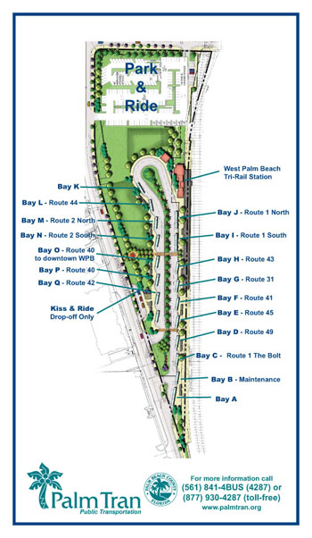 Palm Tran's new, passenger-friendly public transportation transfer station is now open in downtown West Palm Beach. This station allows riders to connect to 11 routes in one convenient location. Located at 150 Clearwater Drive, the intermodal center was built adjacent to the Tri-Rail station to improve connectivity between public buses and trains. Not only will the intermodal center improve transfers from Palm Tran to Tri-Rail, it will connect commuters with Amtrak Trains, Greyhound Buses and the free Trolley Service operated by the City of West Palm Beach.