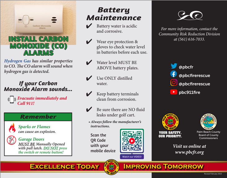 ​Palm Beach County Fire Rescue responds to countless Carbon Monoxide (CO) alarm activations.  However, many of these activations are caused by HYDROGEN GAS that results from improperly charging of golf carts – NOT by carbon monoxide. Both of these gases are odorless and colorless and are silent killers.  Think of a Carbon Monoxide alarm as an oxygen displacement alarm.  As the amount of oxygen in a room decreases and the level of carbon monoxide (or hydrogen) increases, the CO alarm will sound these two gases (CO and Hydrogen) have similar properties. ​
